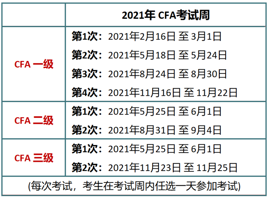 但是从2021年开始,每次CFA机考的考试时间都改为了“考试周”。例如报考2021年2月CFA一级考试的同学,可以选择在2021年2月CFA机考 考试周 (2021年2月23日 – 2021年3月1日) 中的任意一天参加考试。