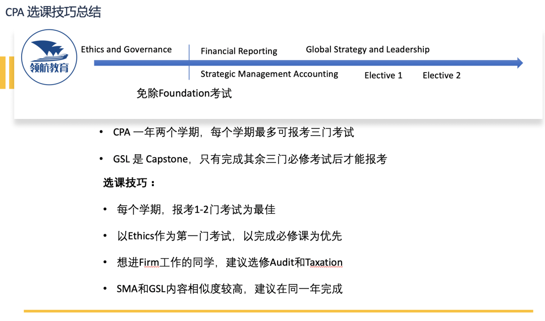Ethics在没有豁免基础课程之前的就可以考这门课,所以很多同学都会在一开始的时候来考Ethics and Governance。对于CPA考试的整体来说,以完成必修课为优先,因GSL这门课你一定要考完EG, SMA和FR三门必修之后才能考。为了不耽误考试进程,优先考必修是应该的!